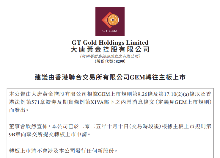 大唐黄金(08299.HK)宣布,已向联交所提交转板上市申请。